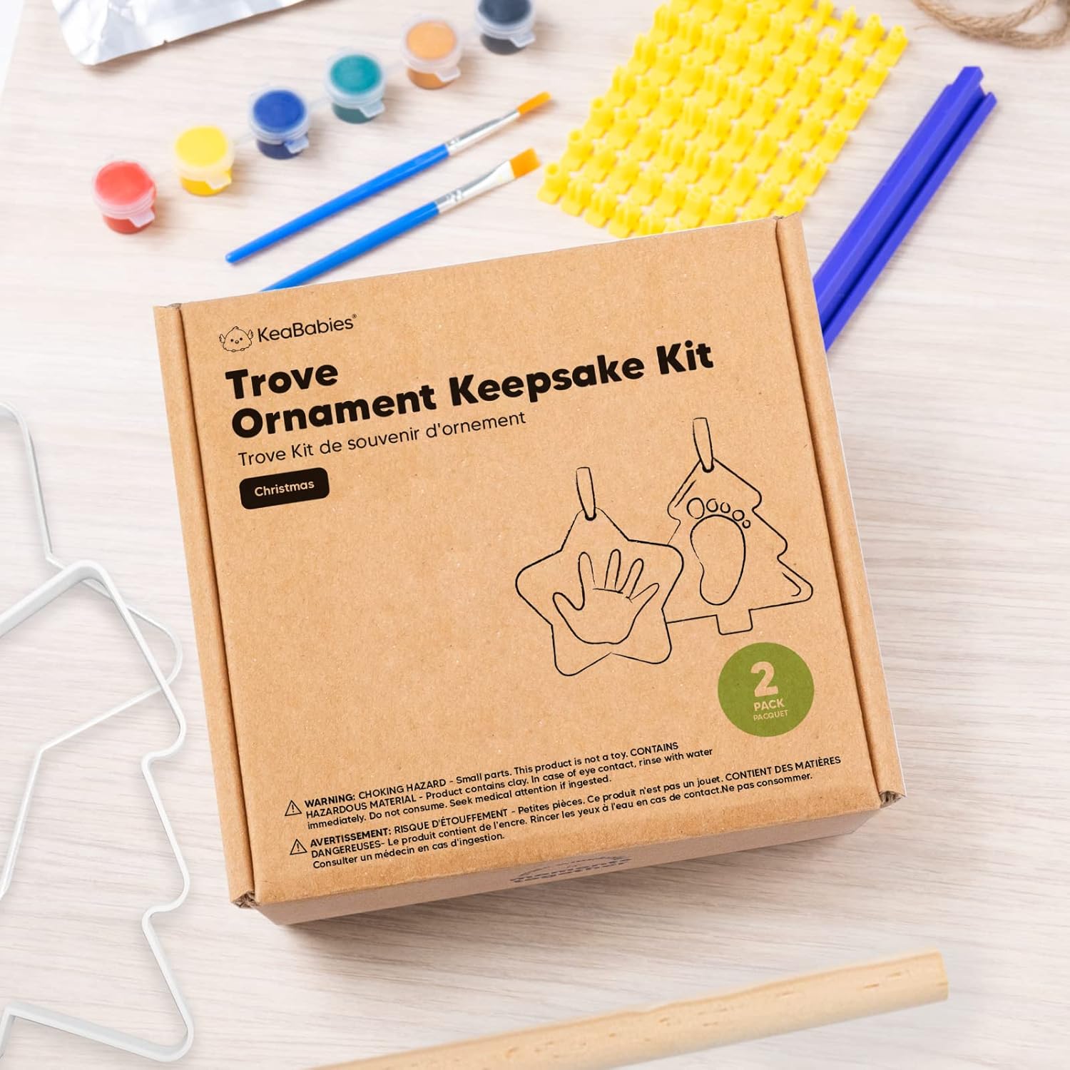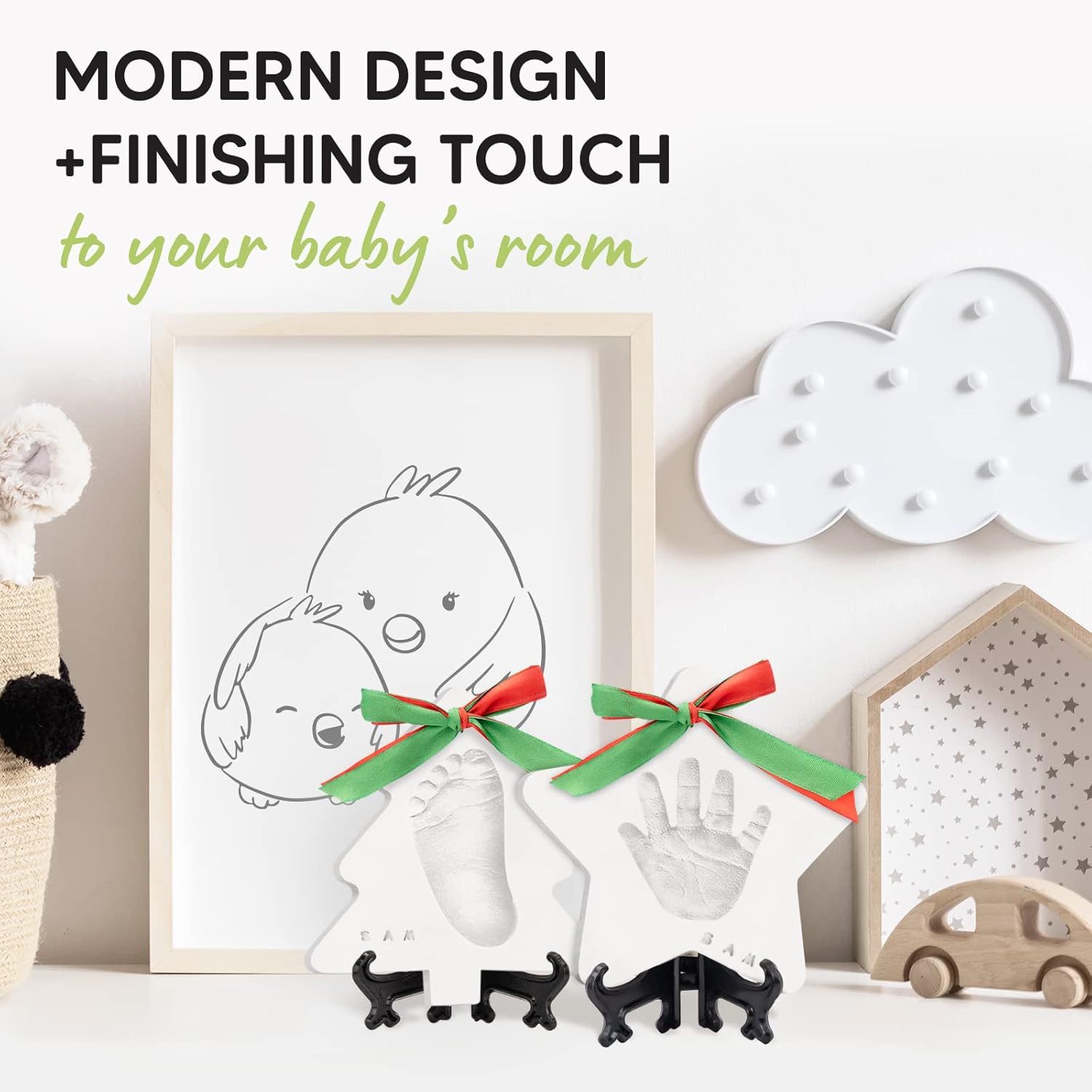• All-Inclusive Kit - Our Trove Hand Print Ornament Kits for babies offer 2 baby-safe airdry clay, 2 shaped rings, multi-colored paints, 2 paint brushes, 6 satin ribbons, 2 twig strings and alphabet stamps. DIY personalized baby gifts for your newborn!