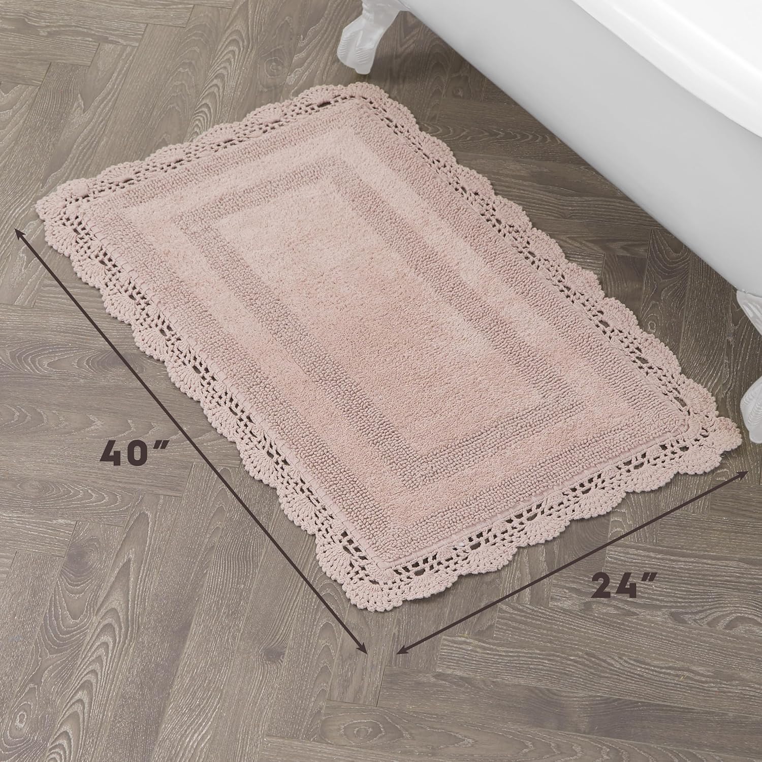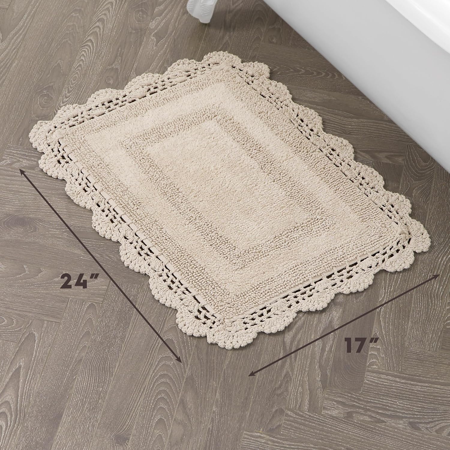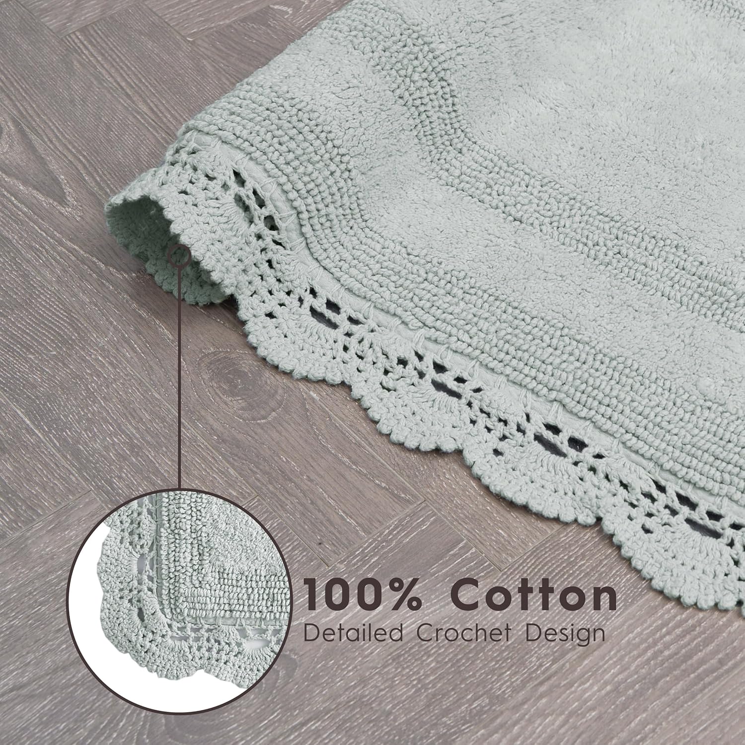 Classically chic, Laura Ashley Crochet Bath Rug Collection features 100% natural cotton rugs in an assortment of rich, saturated colors. Durable cut-and-loop fibers, woven with a lovely crochet border, are reversible for long-lasting use. Available in white, ivory, aqua blue, linen, light grey, indigo, and blush pink. Size options are perfect for any bathroom, bedroom or living area. Backing is 100% cotton - rug pad recommended and sold separately. 2-piece set includes (1) 17" x 24" bath rug and (1) 21" x 34" bath rug. Machine wash cold separately with mild detergent. Do not bleach. For best results, hang dry. Imported.