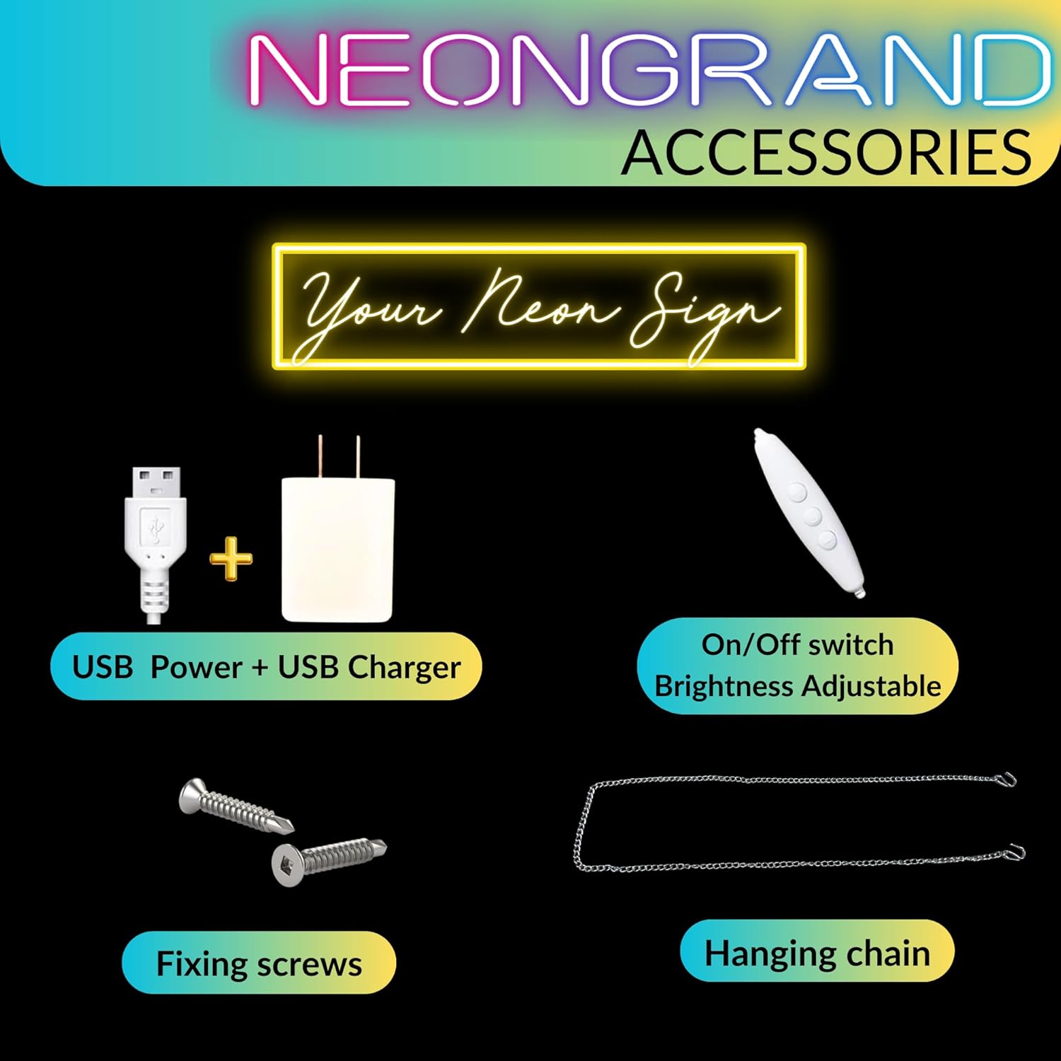 | Included Components | Customized Neon Sign, Remote Control, Power Supply and Adaptor, Screws and Drill Holes for Installation |